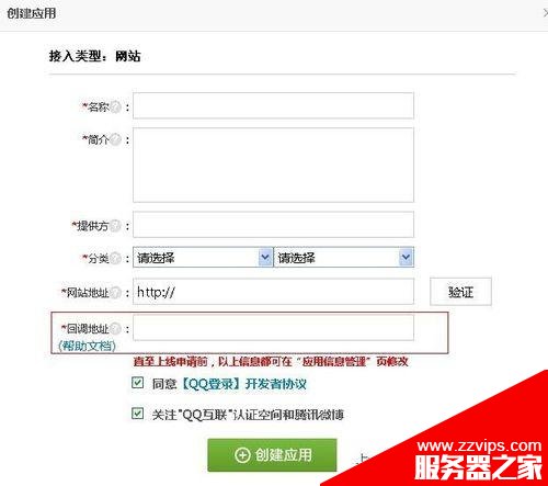 3、选择好之后,接下来就是要填写网站的信息了。里面还需要验证网站,这里就不赘述了。重要的是回调地址的填写。
