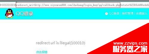4、当你回调地址填写好,网站配置好qq互联之后,进行登录的时候,可能出现redirect uri is illegal(100010)的错误,此时,不要关闭窗口,在错误窗口的地址栏找到如下图所示的网址;