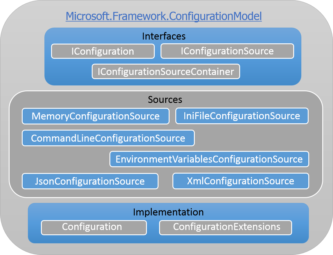 在Microsoft.Framework.ConfigurationModel命名空间下,目前有6种不同类型的配置源类型可以使用,分别如下: