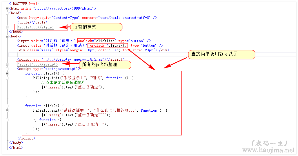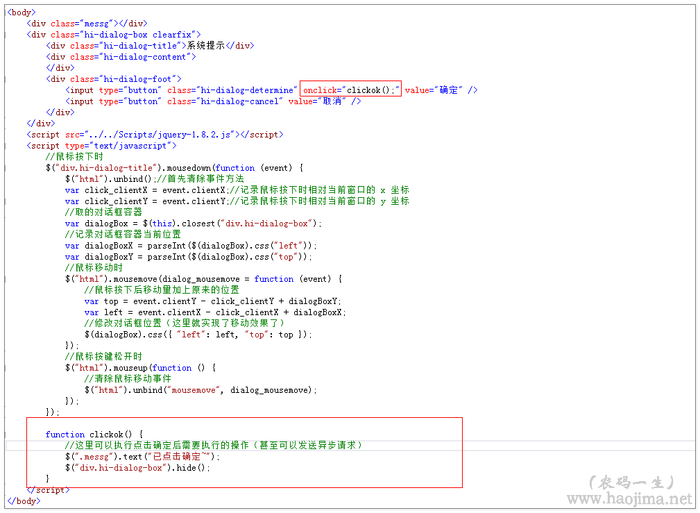 如此,我们点击确定的时候会自动关闭对话框并可以执行自己需要执行的一些操作。可以,有同学会说,你这算什么狗屁对话框啊,html代码全都需要直接编码。是的,这只是简单的说下思路,下面我们来简单整理下。