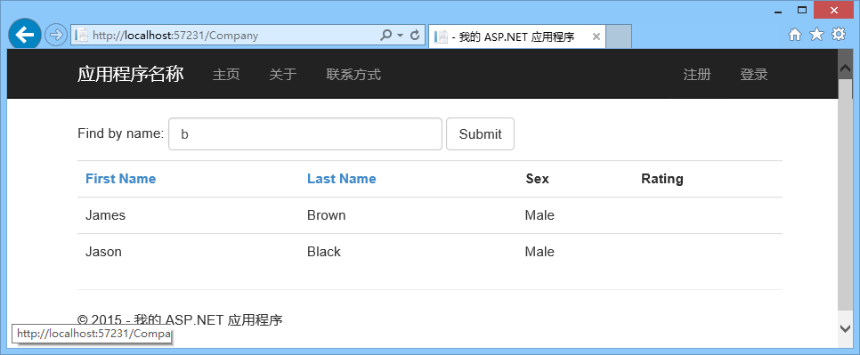 上面代码中黄色的部分就是我们所添加的。第1行,searchString向Controller传递用来搜索的字符串。第7行,字符串不为空时执行搜索。这里的搜索用到了Linq里的Where函数,它通过一个Lambda表达式来筛选出符合条件的数据。这个条件就是9-10行的"或"连接的两个Contains函数。Contains函数表示其所属字符串是否包含其参数字符串。整个筛选条件表示返回所有FisrtName或LastName包含筛选字符串的记录。