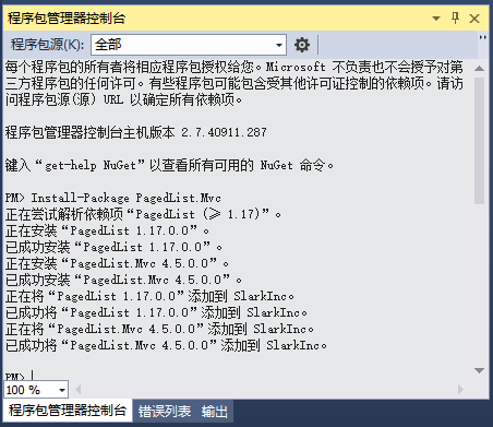 之后会在Visual Studio窗口的下面看到一个程序包管理控制台窗口。在其中输入Install-Package PagedList.Mvc。PagedList就会自动安装到项目中。窗口如下所示。
