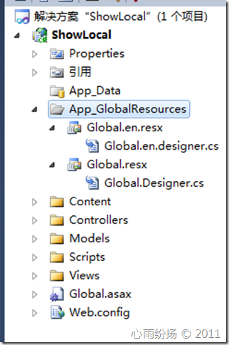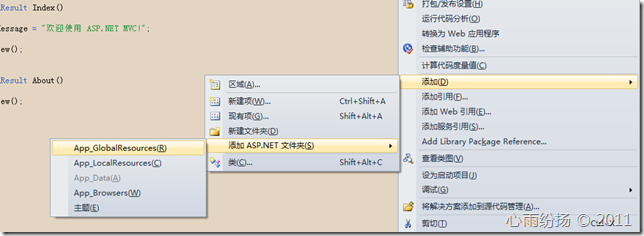 现在我需要做的是把所有的内容从页面和控制器里分离出来,Asp.Net给我们一个名为App_GlobalResources的文件,它里面包含各种语言的全局资源文件。我们只需要在解决方案管理器里的Web项目上右击鼠标,添加->添加至Asp.Net文件夹->App_GlobalResources