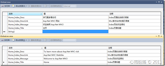 现在让我在资源文件里添加一些内容,在主页上我们需要替换三处:标题、消息还有描述,所以我们在这两个资源文件里添加3个项。