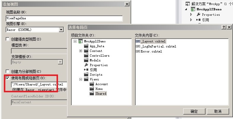 内容页在MVC3中也叫做视图布局页,可以右键选中视图文件夹,通过添加视图来添加内容页,然后选择相应的模板。下面就是我们创建的内容页ViewPageOne.cshtml