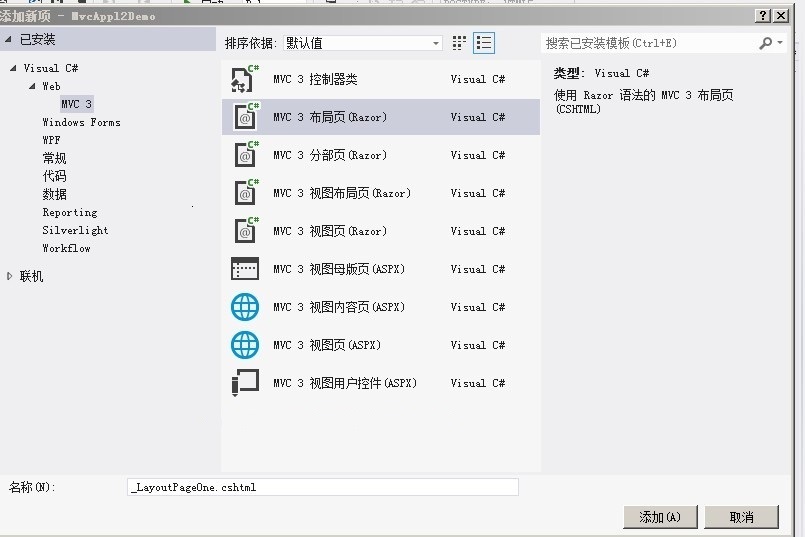 右键选择Shared文件,然后在菜单中选择添加 新建项,弹出添加新项对话框,然后选择MVC3布局页,这样就添加完成了布局页,下面的我们添加的布局页_LayoutPageOne.cshtml