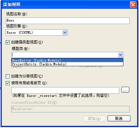 第六步:在News上右键,新建视图。勾选“创建强类型视图”,选择NewsEntity,支架模块选择List