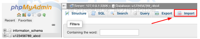 在phpMyAdmin上,默认情况下会选择您的数据库,所以您需先单击Import导入按钮。