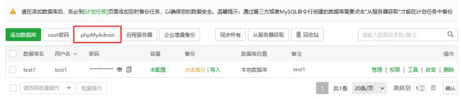 以上是通过宝塔面板访问phpMyAdmin的方法步骤介绍,进入phpMyAdmin管理界面后,您可以对数据库进行操作,例如创建、复制、删除数据等等。