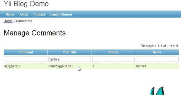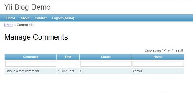 首先,检查你的blog demo里的protectedmodelsComment.php,确保Comment模型有一个search的方法,如果没有,就用gii生成一个,我下载到的blog demo里倒是没有。
