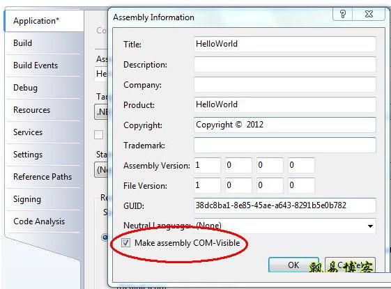 2. 打开项目的属性,在点选左边的 "Application"(就是第一个tab) , 然后点击Assembly Information 按钮 ,在弹出的Dialog中, 必须在底部勾上: Make assembly COM-visible !否则 , 这个dll将不能以COM方式访问 .( 也可以在代码中的类声明中写上[ComVisible(true)] , 效果一样,需要增加using System.Runtime.InteropServices;引用)
