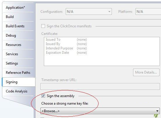 打开项目的属性,点选左边Signing 勾上Sign the assembly 在 Choose a strong name key file:处选择<Browse> 选择刚才创建的HelloWorld.snk文件