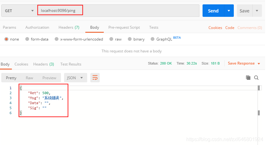 使用postman调用/ping接口,发现返回系统错误