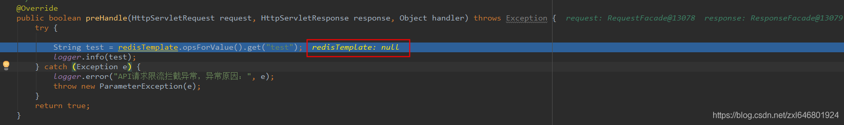 控制台发现是空指针的错误,定位错误发现当我们想获取redis里面key是test的值时,发现redistemplate没有是空的没有注入进来