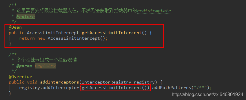 * 这里需要先将限流拦截器入住,不然无法获取到拦截器中的redistemplate