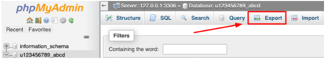 成功访问phpMyAdmin管理界面后,点击Export导出按钮,以导出所需的数据库文件。