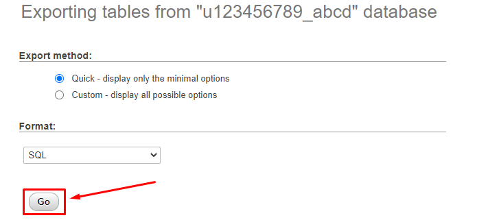 如果您只是想简单地导出SQL文件,那么点击页面中的Go按钮。