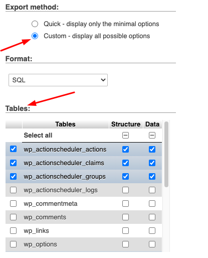 此外,如果希望设置特殊要求,可以更改格式或选择仅从数据库中导出某些表: