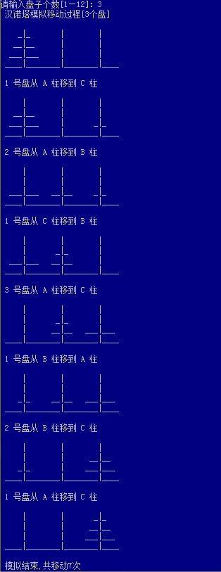 printf("\\n 模拟结束,共移动%ld次\\n", (long)pow(2, n) – 1);