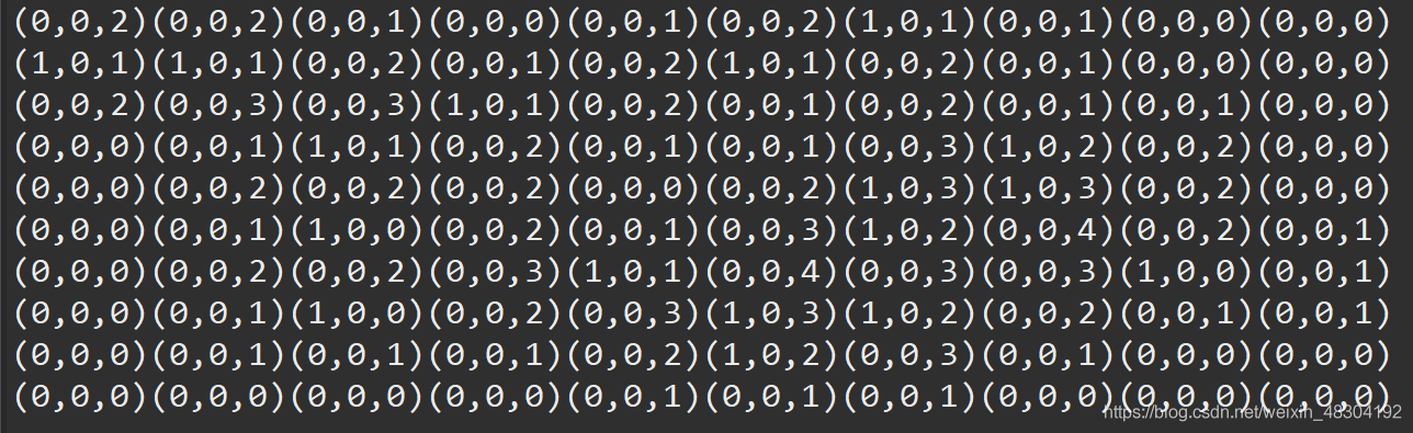 一维数组的下标表示行号,二维数组的下标表示列号,三维数组中存的第一个数据表示的是该位置是否是地雷(0-不是,1-是),第二个数据表示该位置当前显示的符号(0-?,1-#,2-*,3-显示地雷数),第三个数据表示该位置周围的地雷数。例如: