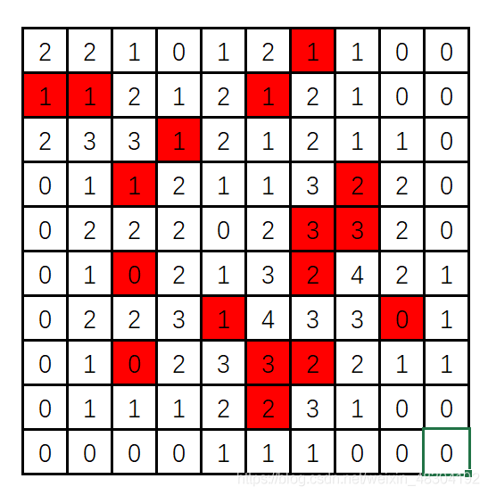 思路:遍历目标坐标点周围的8个坐标点,每当发现一个地雷,则目标坐标点的游戏数据数组中的统计地雷的数值加1。
