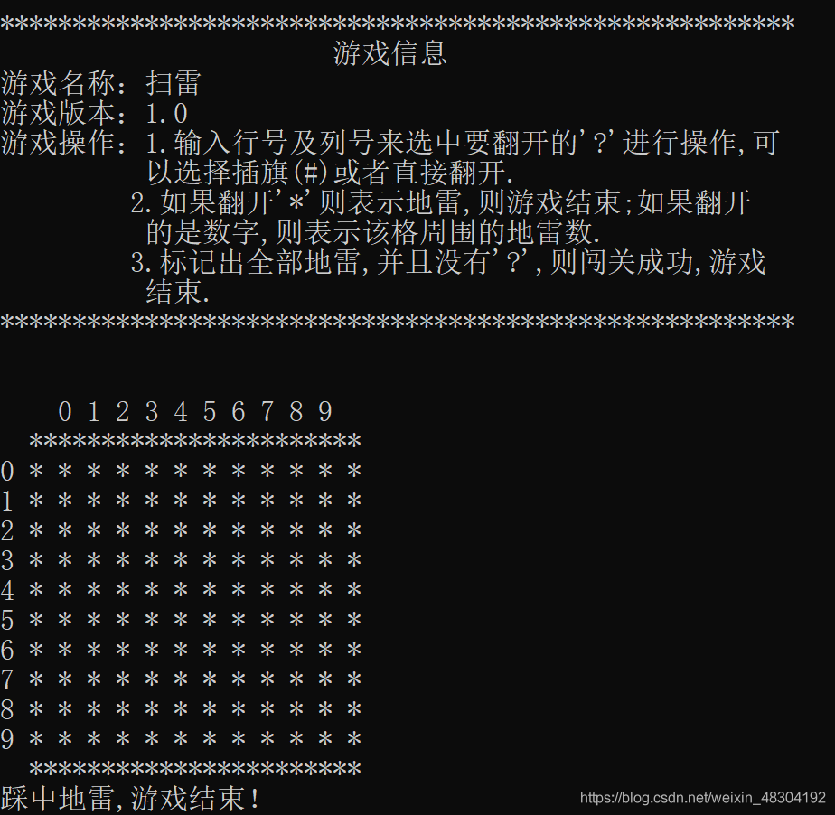 - //由于踩中地雷会把所有标记变成'*',所以只需要判断0行0列的显示标记是不是'*'就行了