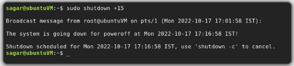 或者,计划在某个时间段后关闭系统,如在15分钟后关闭Ubuntu。