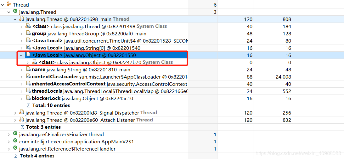 主线程sleep的时候,在terminal窗口执行jmap -dump:format=b,live,file=heapdump.bin 2872命令,生成堆转储快照dump文件,其中2872是进程id,可以使用jps命令查看。然后使用mat工具打开dump文件,可以很明显地看到一共有四类对象可以作为gc roots,下面详细介绍下。