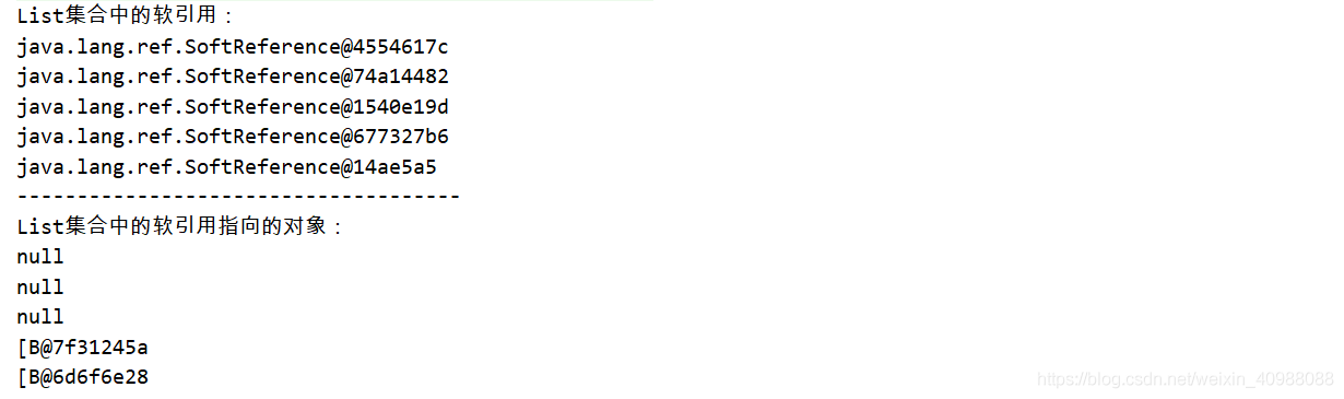 上述代码在堆内存为10m的情况下运行的结果如下图。可以看到前三个软引用指向的对象已经被垃圾回收器回收掉了,原因就是堆内存不够用了,软引用指向的对象就被回收了。