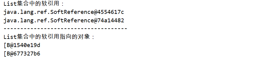 对于软引用指向的对象,当内存不够用时,该对象就会被回收。为演示这个现象,将jvm的堆内存设置为10m(-xms10m -xmx10m)。以下代码的主要逻辑是:向一个list集合中添加5个softreference对象,其中每个softreference对象都指向了一个大小为2m的byte数组,添加完成之后遍历list,并打印list中每一个软引用指向的对象。