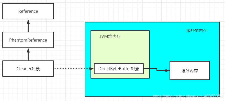 既然不能通过虚引用获取到它指向的对象,那么虚引用到底有什么用呢?实际上,为一个对象关联虚引用的唯一目的就是:在该对象被垃圾回收时收到一个系统通知。当垃圾回收器准备回收一个对象时,如果发现还有虚引用与之关联,就会在垃圾回收后,将这个虚引用加入引用队列,在其关联的虚引用出队前,不会彻底销毁该对象。 上面的描述还是不够通俗易懂,其实虚引用的一个经典的使用场景就是和directbytebuffer类关联使用。directbytebuffer类使用的是堆外内存(服务器内存中,除了jvm占用外的那部分),省去了数据到内核的拷贝,因此效率比bytebuffer要高很多(这里的重点是虚引用,想要了解directbytebuffer类的底层原理,可以在网上找下资源),它的内存示意图如下。