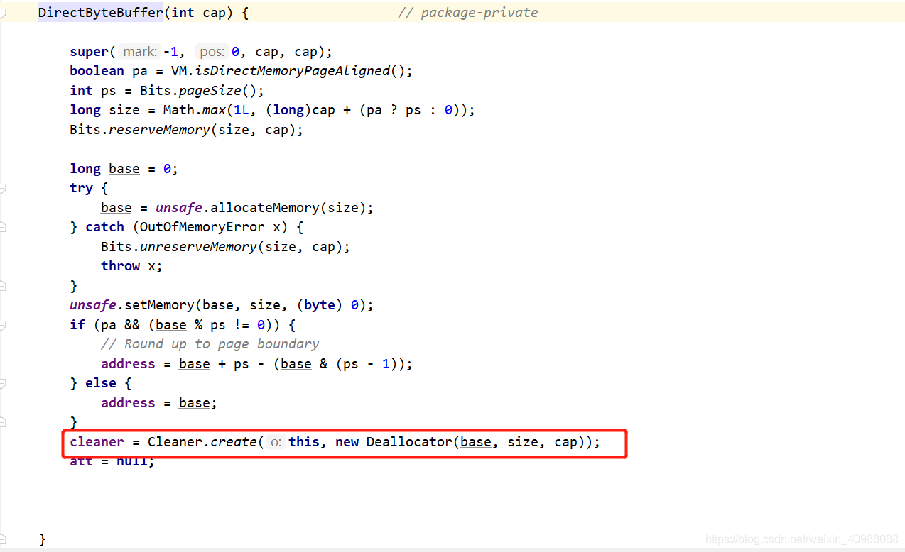 创建direcbytebuffer对象时会同时创建一个cleaner虚引用对象,指向自己,同时传一个deallocator对象给cleaner
