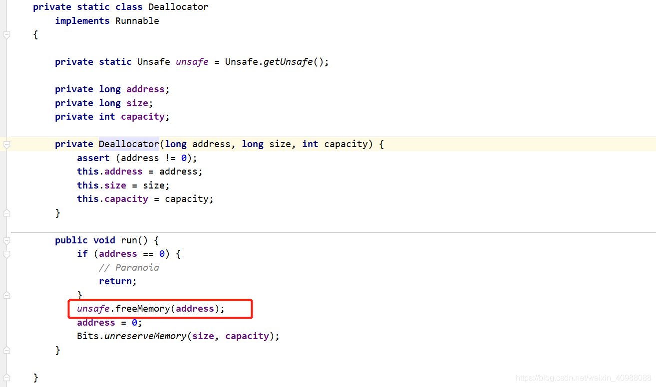 clean方法会调用deallocator的run方法,通过unsafe类最终完成堆外内存的回收