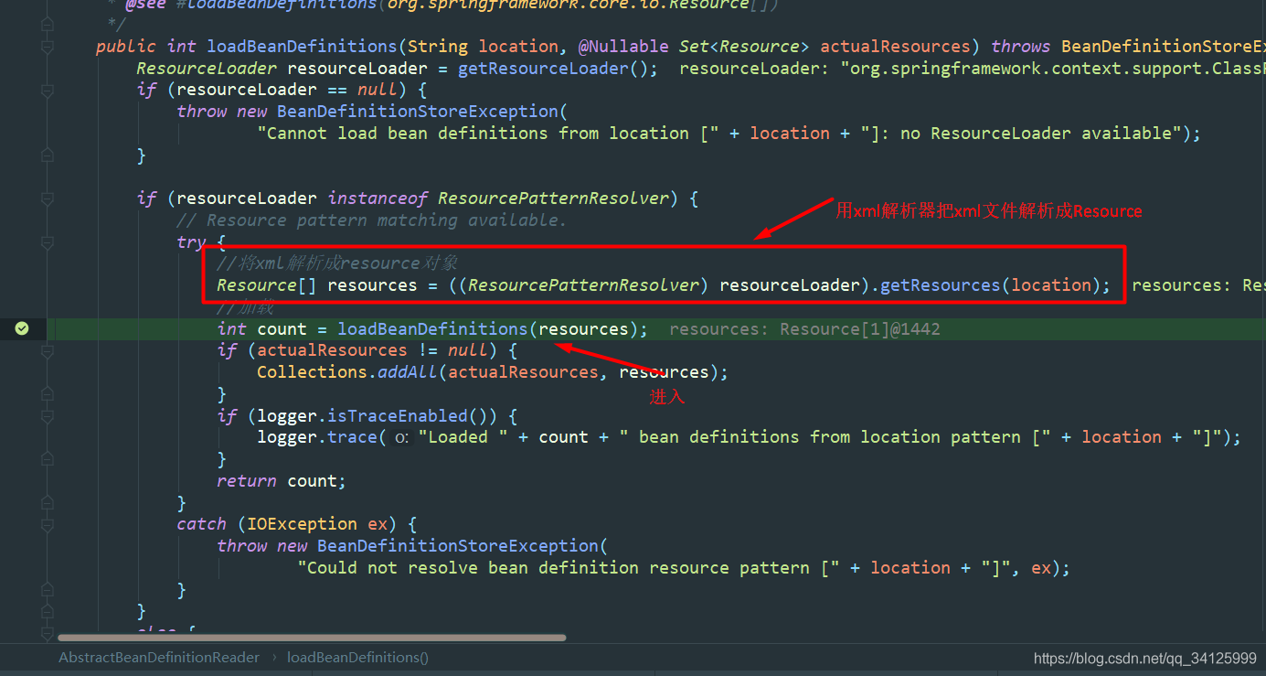 - (3) loadBeanDefinitions(String location, @Nullable Set<Resource> actualResources)方法,将XML解析成Resource对象。