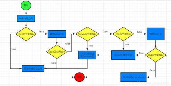 从上面的介绍大家应该有一个大致的印象,一个对象会在Eden区,S0区,S1区,Old区不断流转(当然,一开始就会被回收的短命对象除外),我们可以得到下面的一个流程图: