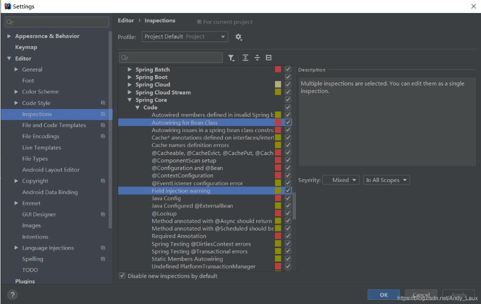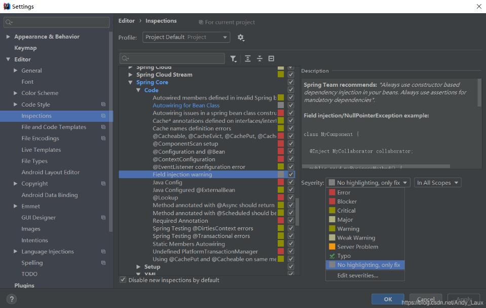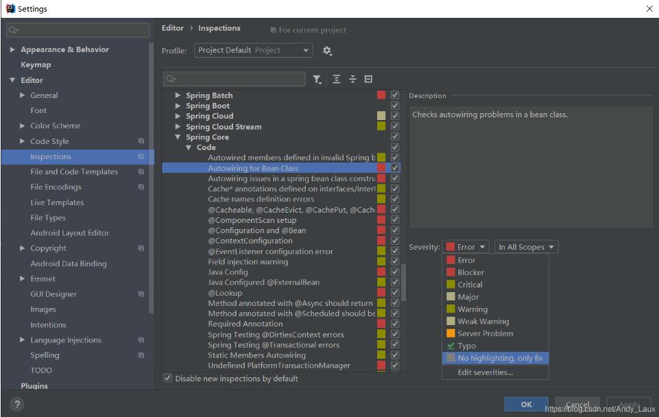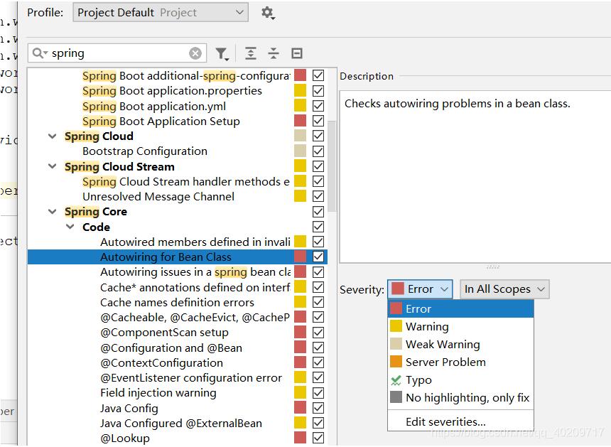 3.输入spring找到 spring core中的Autowiring for bean class,选择Severity中的Error改为Warning.