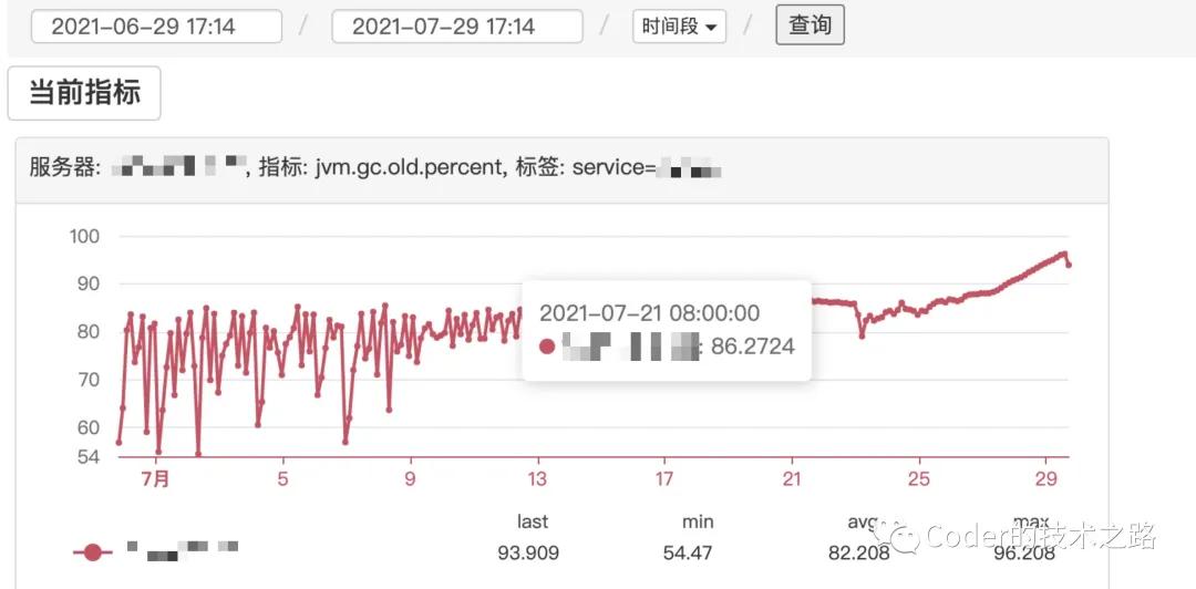 可以看到,在7月中旬之前,内存占用还是比较正常的,每次GC都可以回收掉很大一部分的老年代对象。