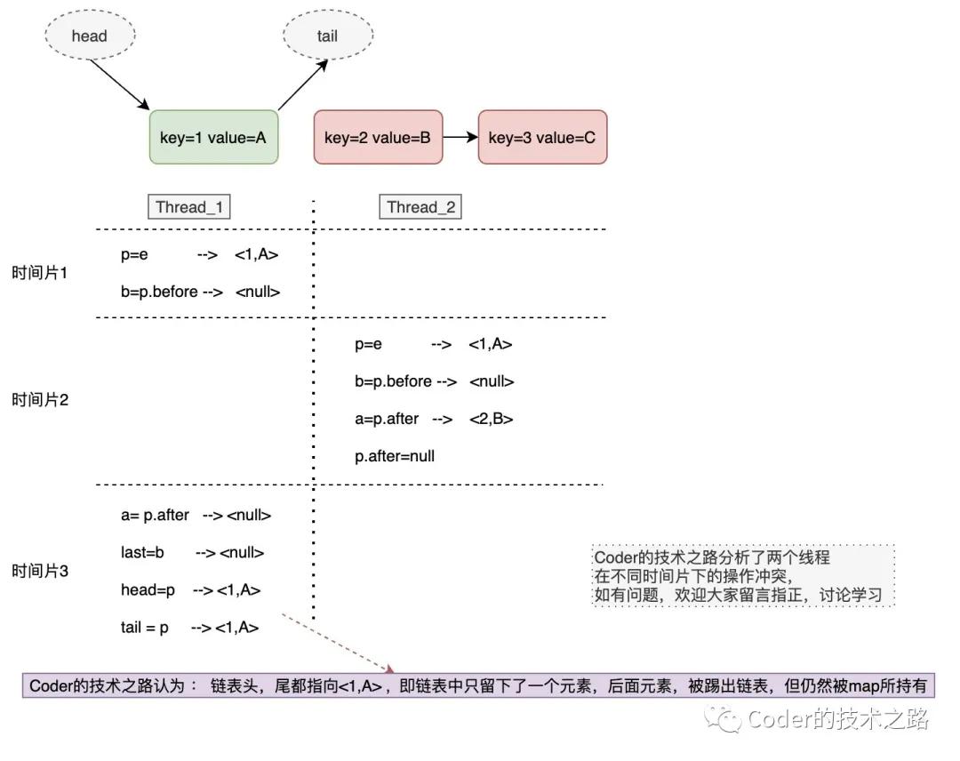我们看到,在线程1执行完前两句,让出了时间片,当线程2执行到p.after=null之后又出让了时间片,这样,本来a应该是后面的<2,B>节点,结果多线程下变成了null,最终,后面两个节点被踢出了链表,删除操作无法触达,造成内存泄漏。