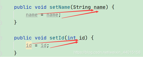 形参的意义就是给属性赋值,我们是要给同名的属性赋值,这时候我们就把形参名和属性的名字写成一样,这样我们就知道我们传入的形参就是要给我们同名的属性去赋值的.
