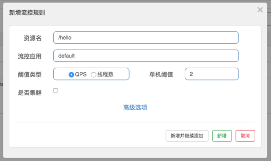 其中 /hello 接口,就是我们上一节中实现并调用过的接口。通过点击 流控 按钮,来为该接口设置限流规则,比如: