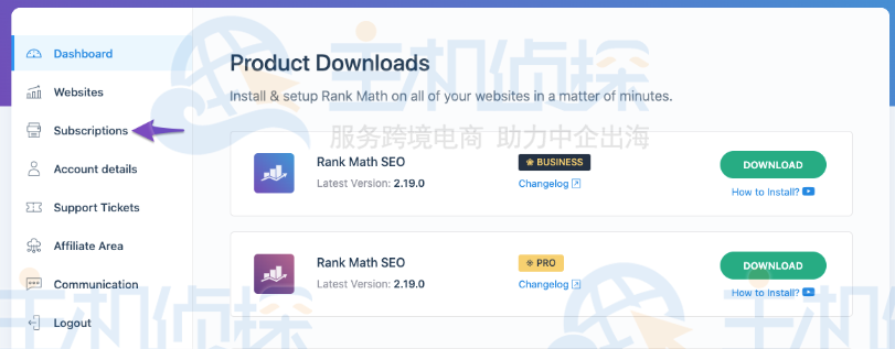 1、登录到Rank Math账号,在管理界面,选择Subscriptions菜单项,如下图所示: