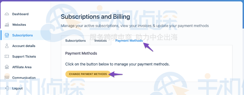 在订阅和计费页面中,导航到Payment Methods选项卡并单击Change Payment Methods更改付款方式按钮。