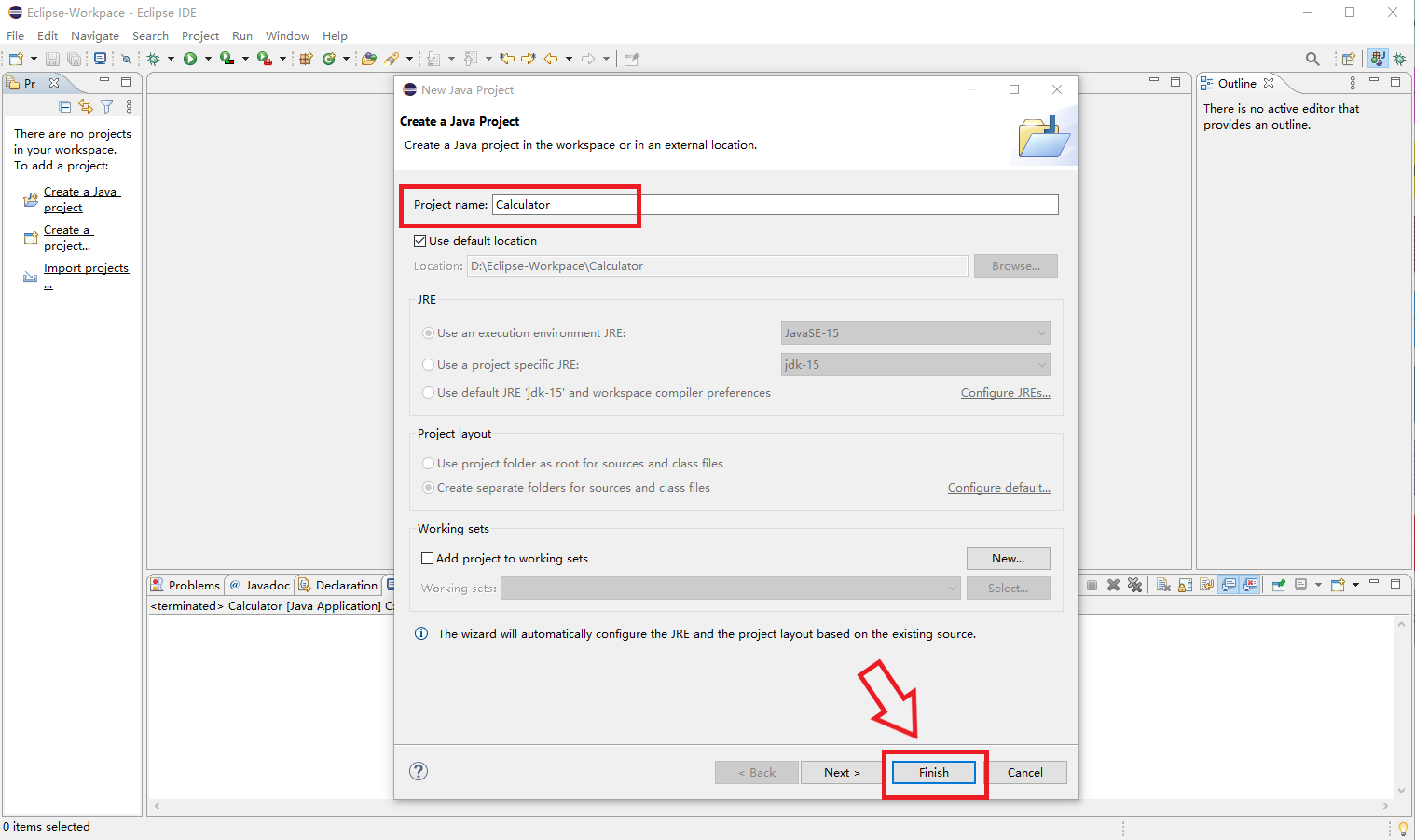 2.在project name一栏填写项目名称calculator(自定义),并点击finish按钮完成创建