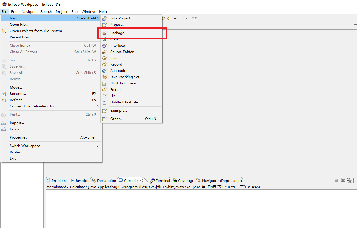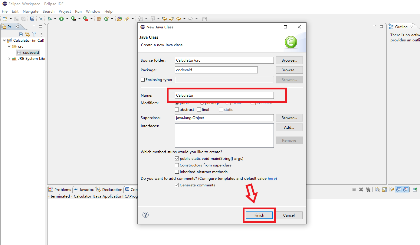5.在新建类的对话框中填写类名 calculator(自定义),点击 finish 按钮完成创建