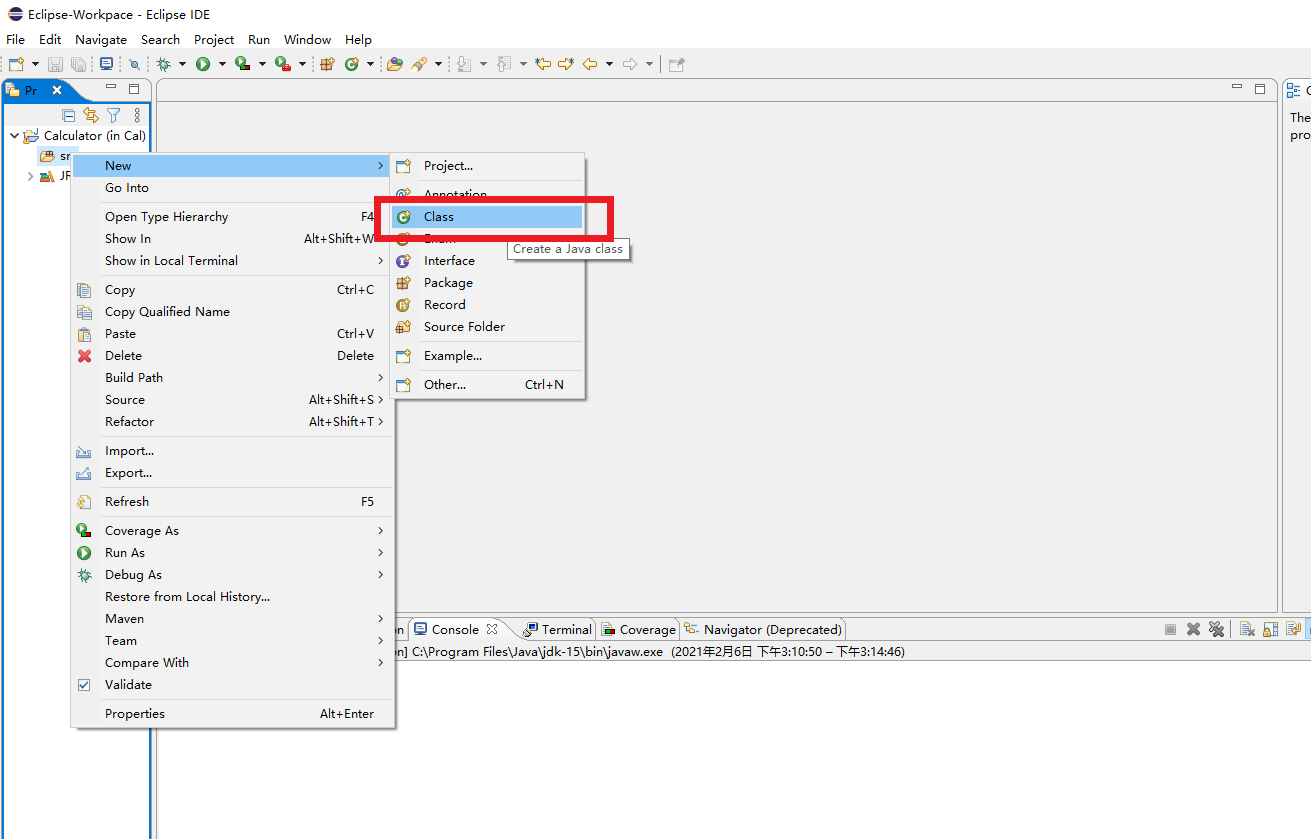 4.在创建好的项目目录src上右键点击,菜单中选择 new -> class 来创建一个类