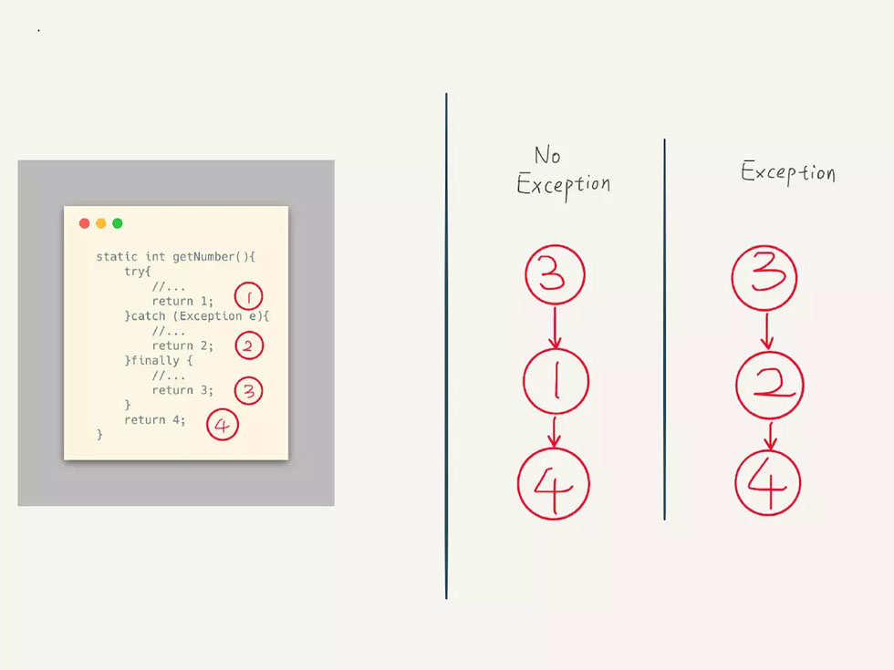 如上图所示,在完整的 try-catch-finally 语句中,finally 都是最后执行的,假设 finally 代码块中存在 return 语句,则直接返回,它是优先级最高的。