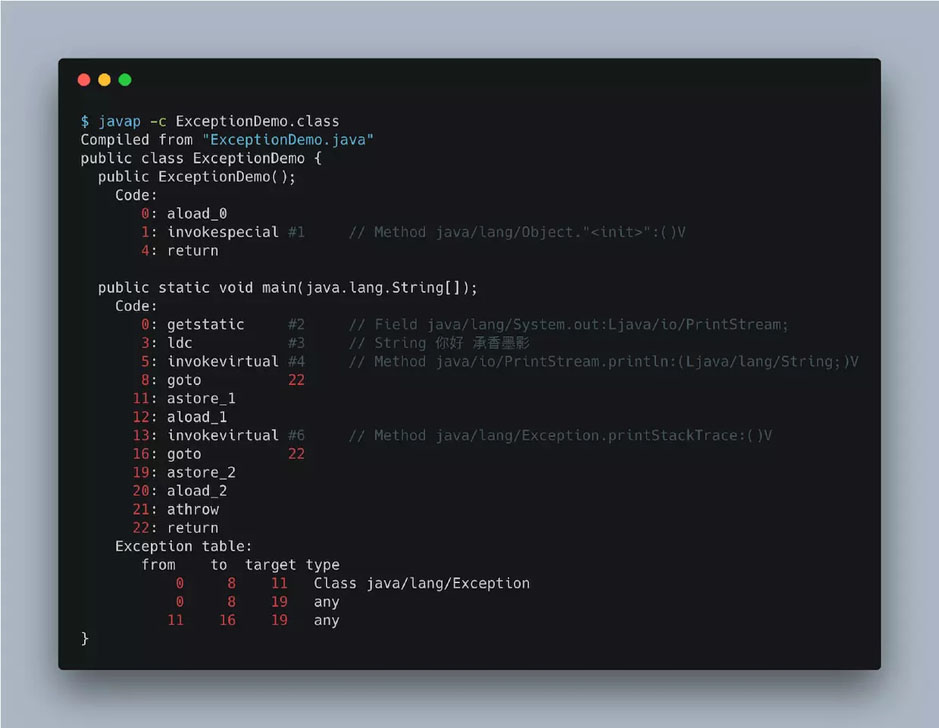 可以看到,末尾的 exceptions table 就是异常表。异常表中的每一条记录,都代表了一个异常处理器。