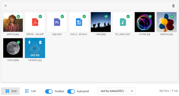 Syncfusion上传组件允许用户加载各种图像、文档、以及服务器端的其他文件。该上传库具有与上述工具类似的功能集,其中包括多个文件的选择、自动化上传、以及拖放等功能。此外,它还支持通过分块(chunking)功能,提供暂停、恢复和重试等选项。虽然仅能在异步上传中起作用,但是块功能可以将选定的文件划分为多个小的数据块,以便AJAX将其传输到服务器上。