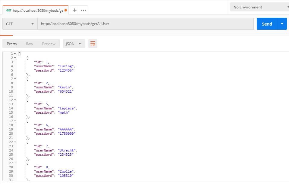 ① http://localhost:8080/mybatis/getalluser 获取所有的用户信息
