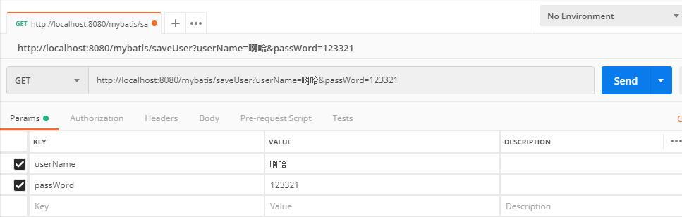 ② http://localhost:8080/mybatis/saveuser?username=啊哈&password=123321 添加一个名字为啊哈,密码为123321的用户